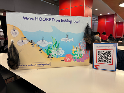 The board starts with six different laser-cut fish hung on hooks. Participants use the clues underneath the fish to sort them into "Local" and "Non-Local" nets.